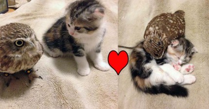 這隻貓頭鷹與貓咪寶寶之間的親密友誼,會讓你忍不住大喊一聲「卡哇伊」!