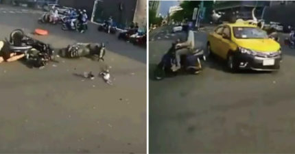 影/小黃搶快「橫掃板橋馬路」 整排機車撞成拋物線…路人傻眼:到底看了什麼