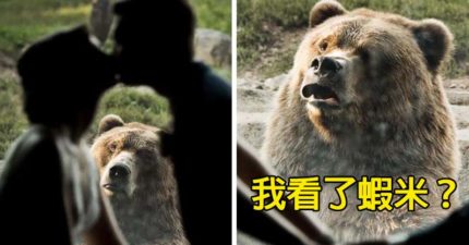 萌熊「滿臉問號」亂入新人合照 親下去大傻眼…終結浪漫
