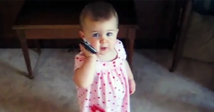 這位16個月大的小妹事業做很大,拿著手機劈哩啪啦爆笑講不停!