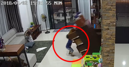 家長注意!小男孩在客廳玩抽屜,結果「整個櫥櫃往向前倒下」差一點就壓死他!(影片)