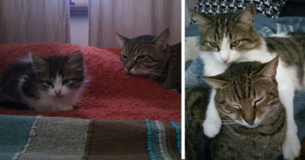 1個月小貓被撿回家後一直非常害怕,2歲貓咪「成為爸爸」用心照顧後「他用超感動萌萌方式報答」!