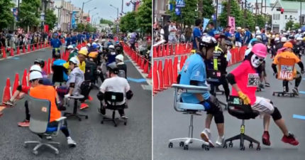 日本舉辦超荒謬「辦公椅賽跑」 選手「倒頭栽翻倒」競爭激烈…冠軍獎品卻讓人傻眼!