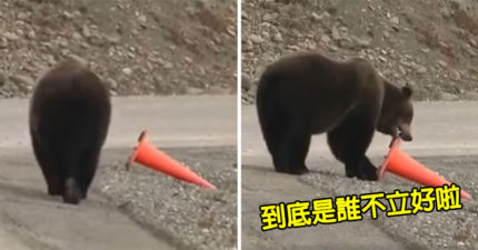 影/工讀生快出來!黑熊路過三角錐「強迫症發作」堅持要扶正