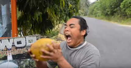 遊客路過這個椰子攤販但都沒有看到可以敲開椰子的器具。當他開始”打開”時我回神已經在買機票去看他表演了!