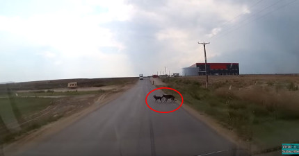 他們開到一半忽然出現兩隻狗狗就快要撞到,接著他們看到其中一隻狗狗嘴裡咬的東西就傻掉了…