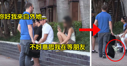 他假裝是遊客去跟女生搭訕但女生說在等朋友,結果當他包包中的鈔票掉出來後女生就立刻站起…