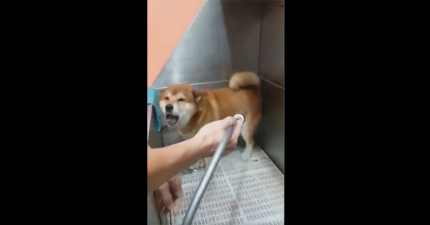 這隻柴犬很不喜歡洗澡,因此當水一潑到他的時候,他使出的超萌「無影腳」抵抗已經讓我笑翻了!