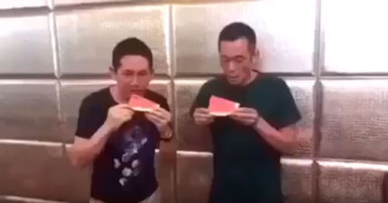 比賽吃西瓜「0.1秒KO」,右邊參賽者「腦炸」反應讓全場笑噴!