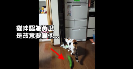 貓咪吃飯吃到一半,被後面”突然”出現的黃瓜給嚇得半死!