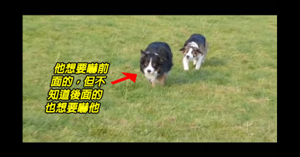 這隻牧羊犬正在悄悄的接近想要嚇最前面的牧羊犬,但不知道後面其實已經跟了另一隻…