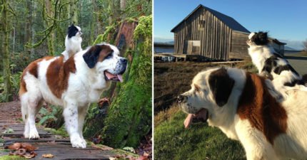 小蝴蝶犬到了新家还以为大只圣伯纳是爸爸,结果大狗就变成座骑了…(有影片有真相)