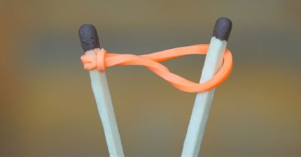 他這樣用橡皮筋把兩個火柴綁起來,當拉其中一個然後再放開…酷!