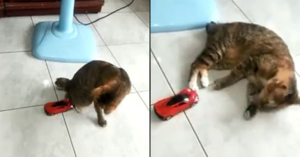 戲精貓遭「玩具車」攻擊 秒倒地衰臉求救:本王受傷快護駕!