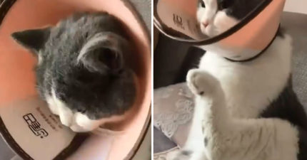 頭套喵星人硬要「舔毛打理」 鏡頭往下一移:在舔平行時空的自己?