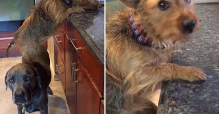 想偷吃但拿不到 長腿汪派上用場!狗狗疊羅漢成功完食