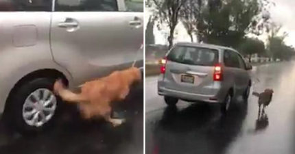 邊開車邊遛狗!狗狗被鍊在車上 幾乎被拖進車輪下