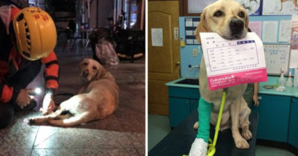 腳腳受傷忍痛不放棄搶救,鐵雄任務結束「右前腳一大包」。自己咬藥袋堅強模樣讓人不捨