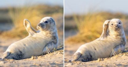 小海豹悠閒躺沙灘「對鏡頭揮手」 下秒困惑搔頭動作實在太可愛❤