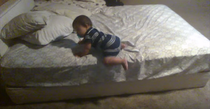 他們不懂為什麼兒子可以爬下這麼高的床,直到放了攝影機錄下了他「超天才的妙招」!