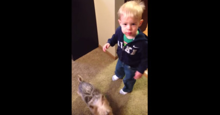 一位媽媽給兒子狗食要他教狗狗「坐下」,結果…喂!兒子你在做什麼?!