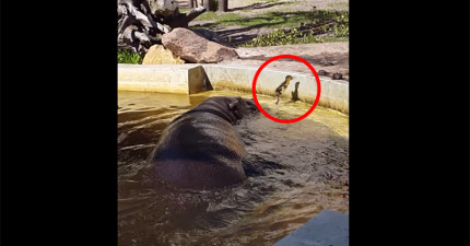 這隻小鴨困在水池跳不上岸找媽媽超緊張,但看看河馬在1:37做的事兒…太可愛了!