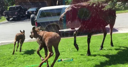 他們看到麋鹿在家門外很熱的樣子就開了灑水器,沒想到就上演了超迪士尼的可愛畫面。