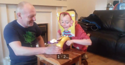 爺孫一起玩這個「轉到對的數字就被派打臉」的遊戲。這遊戲的結果真的會讓人忍不住大笑出來啊!