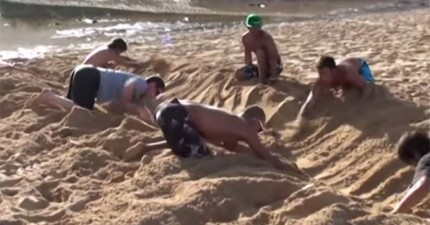 這群衝浪客來到沙灘不停挖沙,在我正想關掉視窗的時候驚奇就大噴發了!