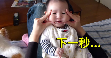 當這名小寶寶被媽媽捏臉捏到煩了,瞬間轉變的表情讓媽媽連忙大喊「對不起啦~」