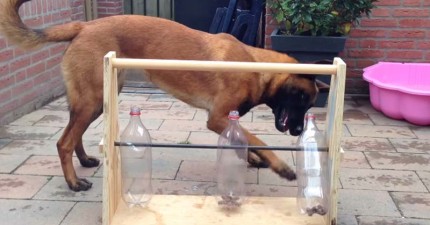 這位主人覺得把狗飼料放碗吃得太快,於是設計了這個讓狗狗自己玩一整天的超強發明!