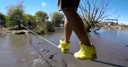 這名強者挑戰在鱷魚進食時走超細繩索橫越,最後整個大搖晃時我心臟都要撞開肋骨了!
