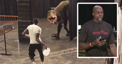 這些NBA球員在球場中走到一半,一隻超大隻的恐龍就出現要把他們的頭給咬掉!