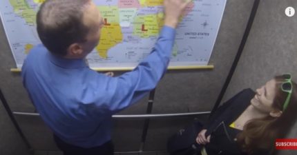 他們搭電梯搭到一半,旁邊的人突然拉下「氣象圖」開始預報「今日天氣」…他們全崩潰! (影片)