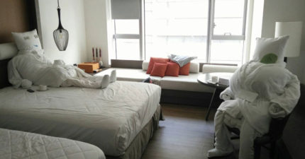 台南飯店打掃人員進去房間後,瞬間被2個「白色屍體」嚇到開心的笑出來!