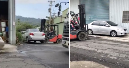影/工業區亂停車擋到人送貨 霸氣堆高機曬「高操技術」:我幫你停!