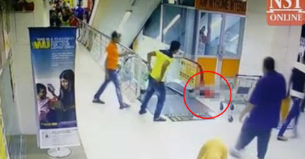 百貨公司監視拍到,小女孩從電扶梯上「摔下」。父母絕對不能這樣玩!(非趣味影片)
