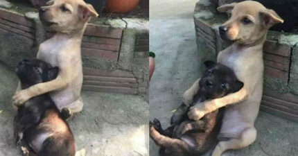 兩隻狗狗被不負責任主人拋棄後,比較大的就這樣抱著弟弟保護他。