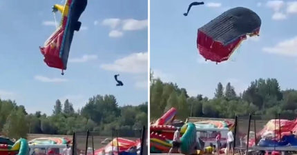 影/突然一陣強風!充氣城堡裡面小孩「跟著飛上天」