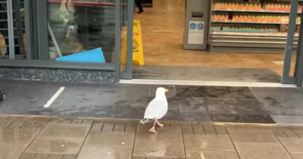 影/請支援收銀!海鷗大盜熟練「等自動門」 淡定進超商一叼「20秒逃逸」