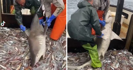 影/小鯊魚誤上捕漁船!大口爽吃「鮮魚Buffet」不肯下船