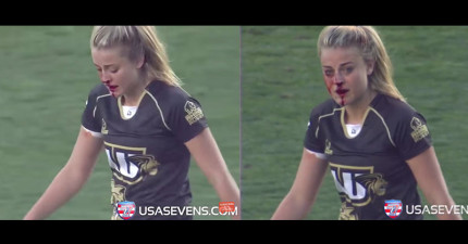 她被撞歪鼻子後沒有下場休息,你看到她在38秒吐出的東西後就會了解為什麼大家都稱她「橄欖球女戰神」!