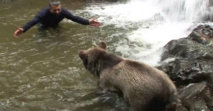 這隻熊見到這名在河裡的男子後,衝過去做的驚人舉動已經讓我融化了。