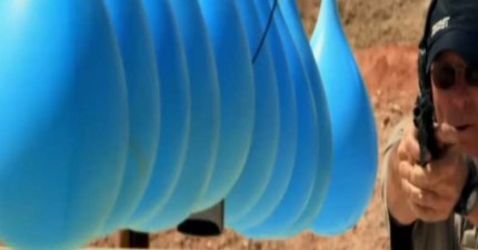 他朝著一排水球開槍,你猜要幾顆水球才能將子彈擋下來呢?
