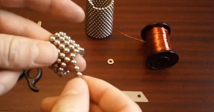 他將這些強力磁鐵球纏在手指上,當把電池擺上去之後…這完全應該編進教科書範例實驗呀!