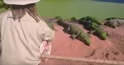 飼育員將雞肉丟進鱷魚群之後,突然間其中一隻鱷魚的前腳就被扯斷了…
