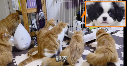 主人帶了一隻小狗狗回家,於是家裡6隻貓咪便開始「面試新人」…