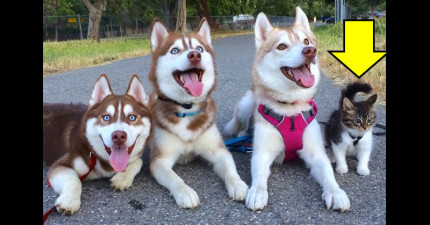 這隻哈士奇見到流浪小貓後就「母愛大爆炸」,小貓長大後居然走路跟狗狗完全一樣!