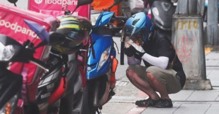 脫口罩怕被民眾公審!外送員蹲路邊角落「匆匆吞漢堡」