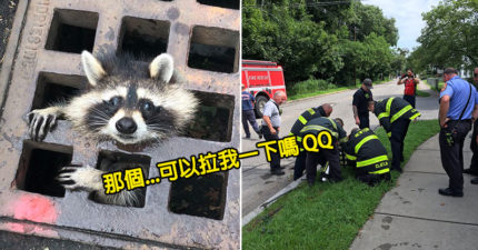 呆萌浣熊「卡在水溝蓋」超可憐 消防局出動「10位壯丁」救援…路人憋笑:是不是吃太好?